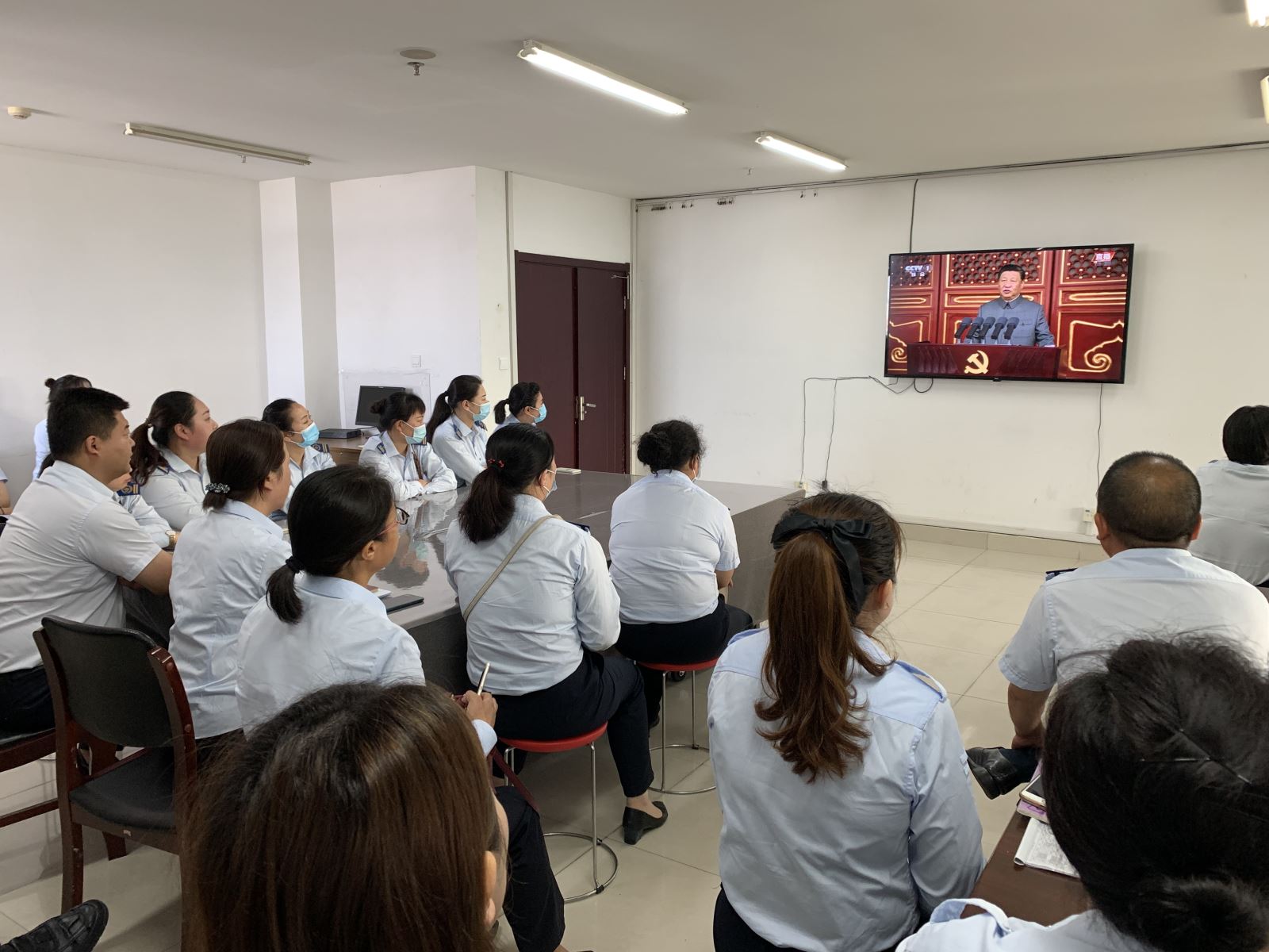 機務技術事業(yè)部黨支部組織全體黨員到會議室準時收看慶祝大會,其他工作人員用電腦或手機收看。
