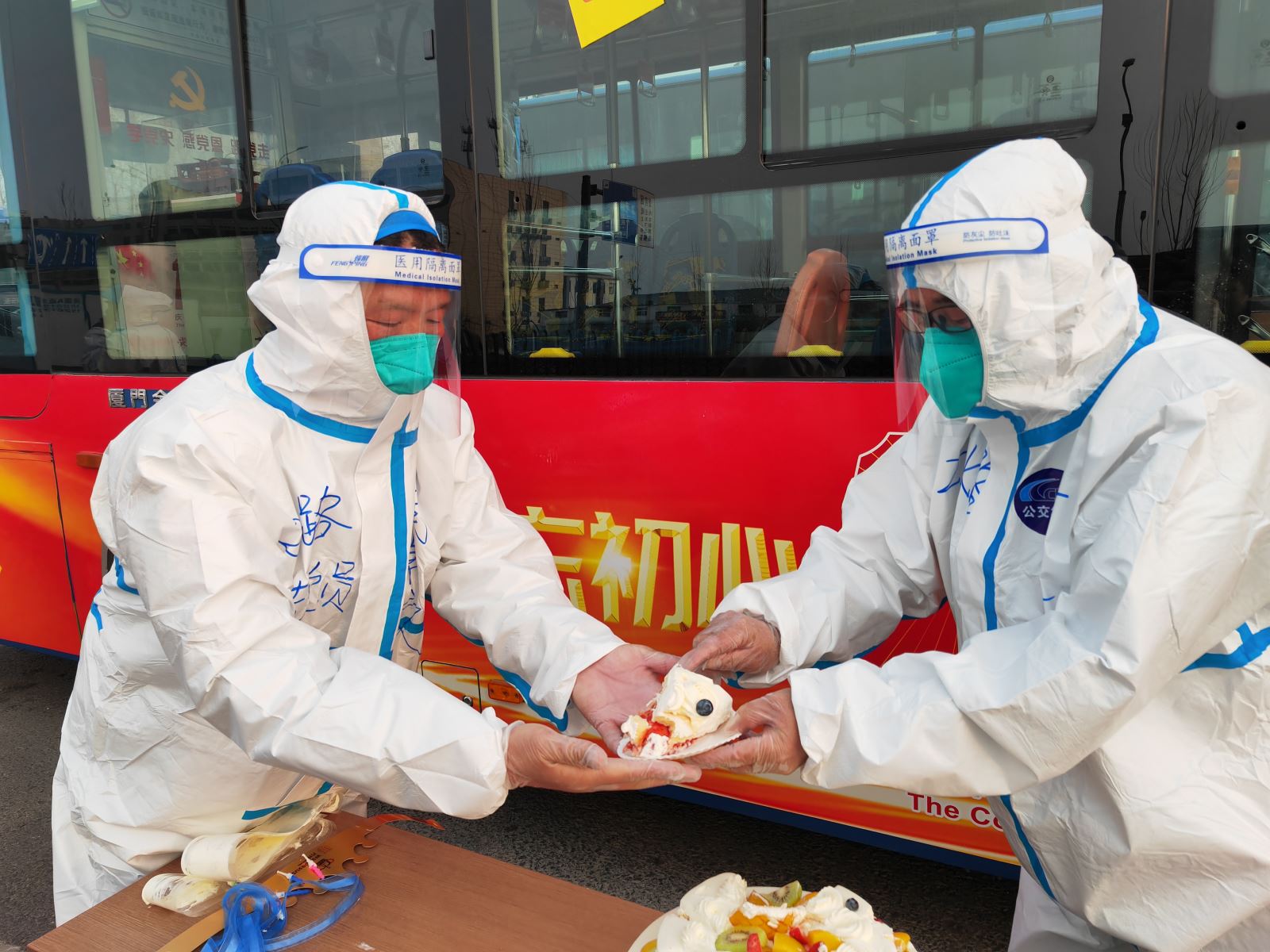 3月23日晚間,在轉運任務結束后就餐之余,駕駛員李愛民聊侃到今天是自己50歲生日,同時其他幾位同事也說生日就在這幾天,大家互相之間心照不宣的送了祝福。這樣一段小小的對話給在場的20路線長周卓文記在了心里,他將此事上報了轉運工作領導小組,大家得知這一情況后,決定悄悄為他們補過一個特殊的生日。