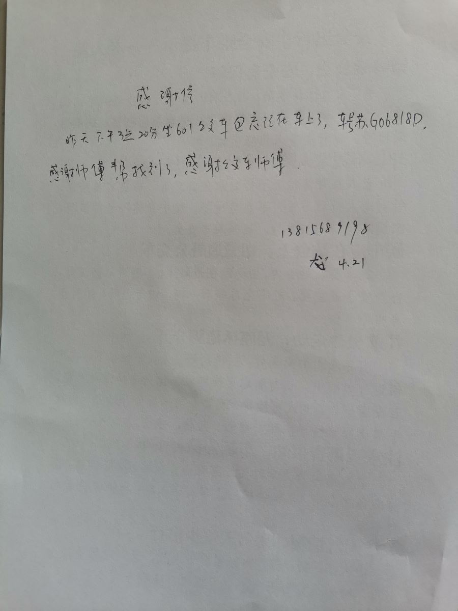 沒過多久,失主尤女士來到了大港路停車場調(diào)度室領取了自己丟失的包及手機,她當場寫下感謝信,對李傳新師傅表示萬分感謝。