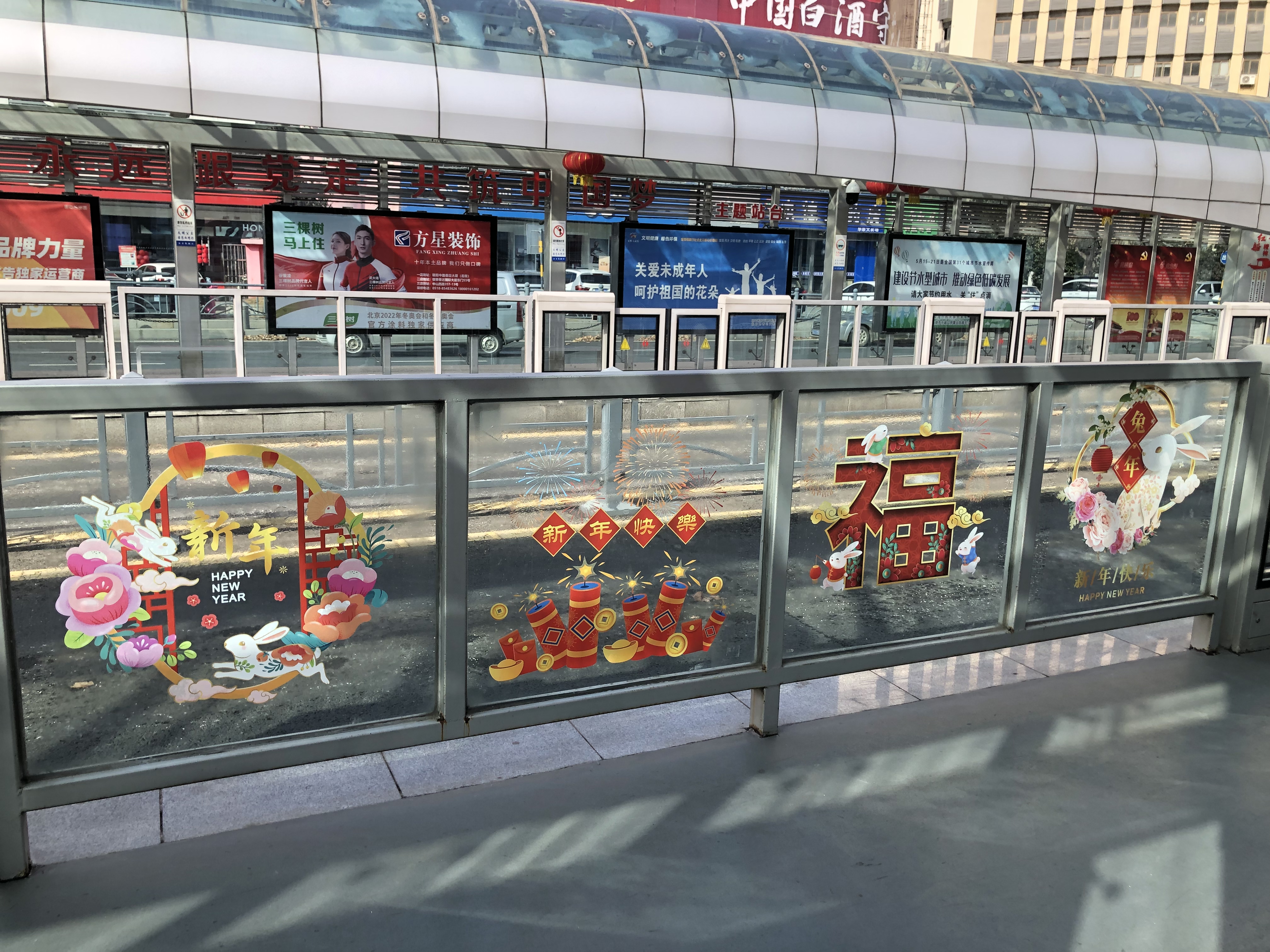 站臺(tái)換上節(jié)日的盛裝,走進(jìn)站臺(tái)魚頭處,首先兌幣機(jī)亞克力板上張貼的兔年大吉映入眼簾,從進(jìn)站口到閘機(jī)處地面上貼有“迎新春、過(guò)大年”的腳丫貼紙,站房頂部四周貼上紅色打底、燙金福字的拉花,走進(jìn)站臺(tái)內(nèi),安全門旁的玻璃上貼有2023新年快樂(lè)、兔年快樂(lè)、福字、鞭炮、燈籠等13個(gè)具有新年感的玻璃靜電貼。這次主題站臺(tái)的裝飾,將傳統(tǒng)與現(xiàn)代相結(jié)合,讓每一位市民乘客在乘坐BRT時(shí)感受到濃濃的年味。經(jīng)常乘車的王女士說(shuō):“BRT站臺(tái)裝扮的太漂亮了,感受到了新年的味道,也祝BRT2023年越來(lái)越好!”