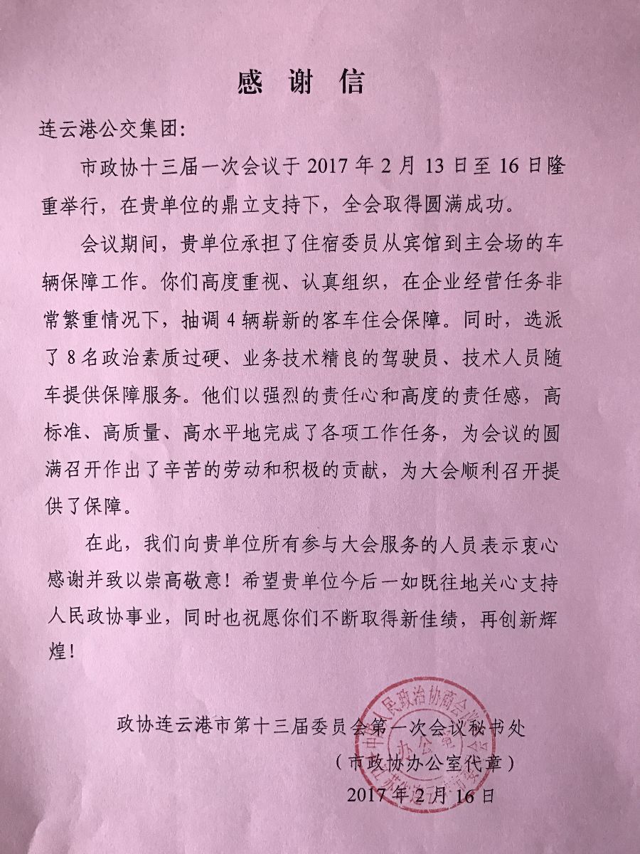 來(lái)源:綜合辦公室 作者:倪子棠 2月20日,市政協(xié)秘書長(zhǎng)劉玉君、副秘書長(zhǎng)張孝昌等相關(guān)人員來(lái)到公交集團(tuán),對(duì)公交集團(tuán)圓滿完成兩會(huì)期間交通運(yùn)輸保障工作給予了充分肯定,并向辛苦付出的駕駛員和工作人員致以感謝和慰問(wèn),并致以感謝信。 2017年2月13日—16日,我市隆重舉行市政協(xié)十三屆、市人大十四屆一次會(huì)議,公交集團(tuán)承擔(dān)了兩會(huì)期間住宿委員從賓館到主會(huì)場(chǎng)的車輛保障工作。公交集團(tuán)高度重視、召開(kāi)專題會(huì)議,周密安排,認(rèn)真落實(shí),抽調(diào)20輛嶄新的客車住會(huì)保障,選派政治素質(zhì)過(guò)硬、業(yè)務(wù)技術(shù)精良的駕駛員、技術(shù)人員隨車提供保障服務(wù),他們以強(qiáng)烈的責(zé)任心和高度的責(zé)任感,高標(biāo)準(zhǔn)、高質(zhì)量、高水平地完成了工作任務(wù),為會(huì)議的圓滿召開(kāi)做出了辛苦的勞動(dòng)和積極的貢獻(xiàn),受到了會(huì)代表的一致稱贊。