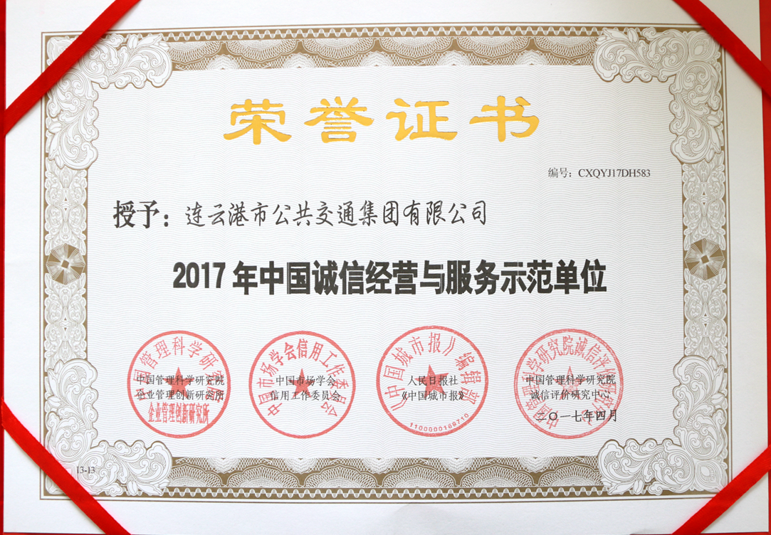 公交集團有限公司作為城市重要窗口行業(yè),多年來一直秉持“服務于民、奉獻社會”的宗旨,始終堅持誠信為本的理念,以誠信、優(yōu)質的服務,倡導“誠信服務、真情奉獻、開拓創(chuàng)新、和諧發(fā)展”的企業(yè)精神,在推進良好社會風氣的形成,構建和諧社會,傳播精神文明等方面發(fā)揮著重要作用。經過前期各個部門的評審、公示、復查等程序,連云港市公交集團榮獲第十四屆“中國誠信經營與服務示范單位”殊榮。