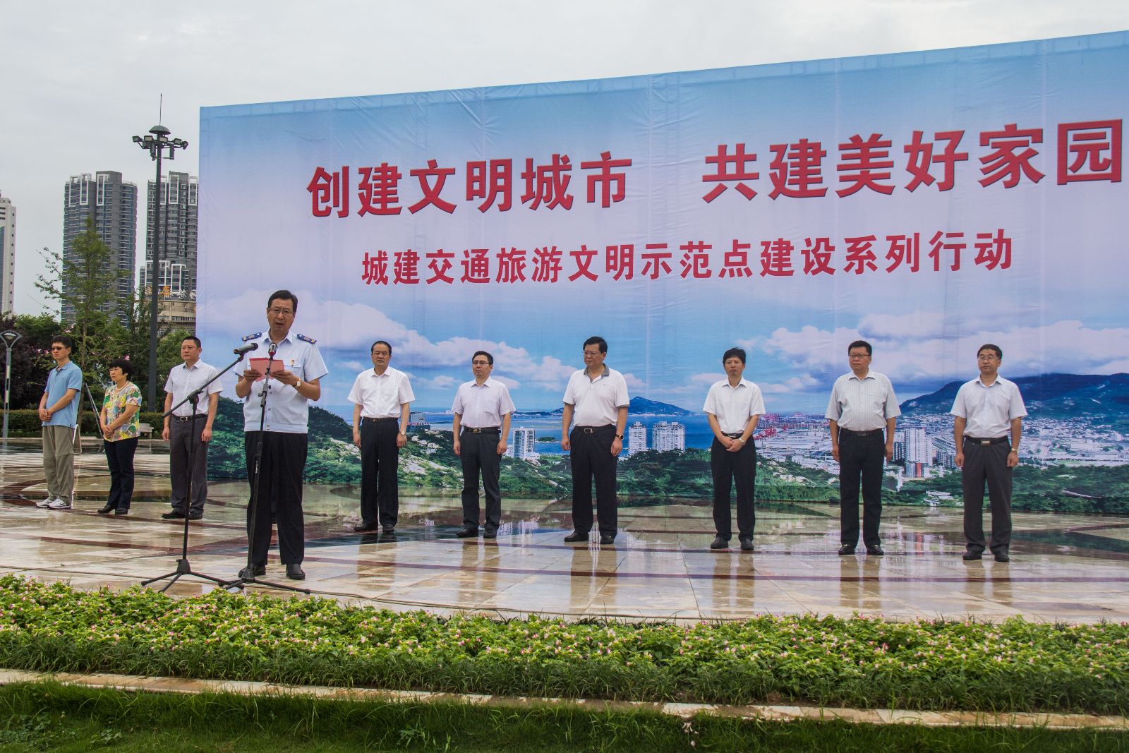 7月15日上午,連云港市城建交通旅游文明示范點建設(shè)推進會在蒼梧綠園中心廣場舉行,本次推進會的主題是“創(chuàng)建文明城市,共建美好家園”。公交集團領(lǐng)導班子成員、機關(guān)部室全體干部職工、基層單位管理人員等100名員工參與本次推進會。