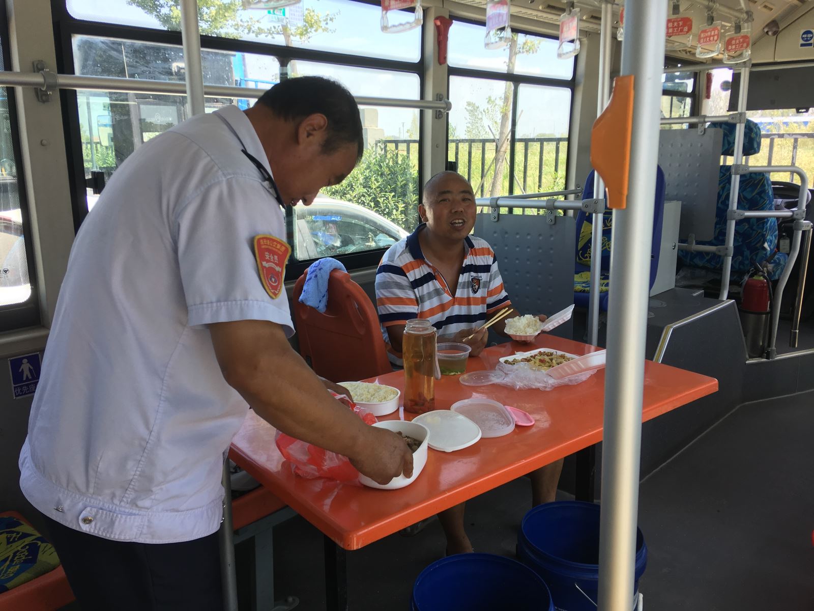 即使是在高溫天氣,為了保證市民乘客的日常出行,港城的公交人們?nèi)淌苤邷乜崾钜琅f堅守崗位,默默地揮灑著汗水。公交集團海通公交公司為切實踐行“分公司為一線駕駛員服務(wù)”的服務(wù)理念,各分公司實行輪流值班制,在線路車輛密集的西城公交停車場,上午10:30左右,公司安排一輛電動車停放場內(nèi),車上擺放了簡易餐桌和飲用水供駕駛員休息、吃飯使用。