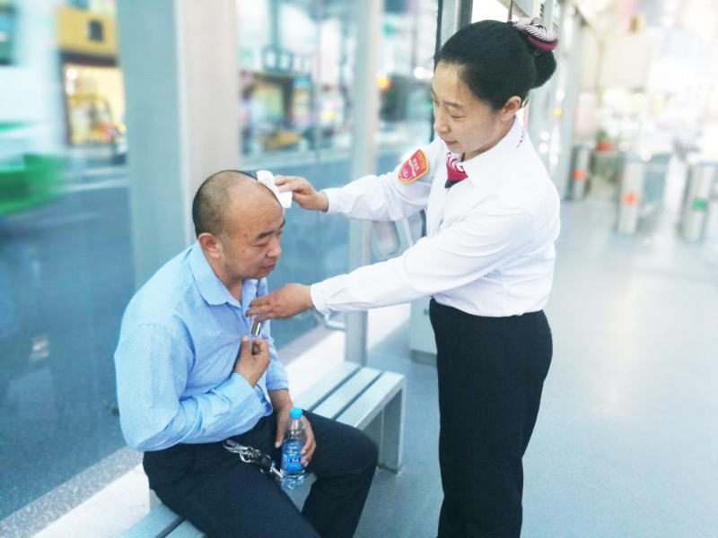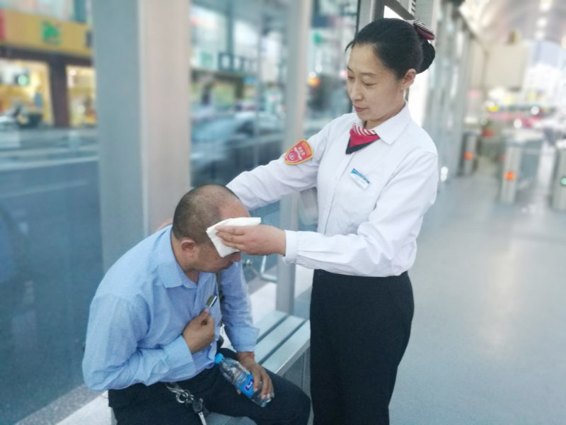 一次,我在移動公司站上晚班,有位老人下車后便趴在安全門上,我便用廣播安全提示:“乘客們,你們好,為了您的安全,請您不要趴靠安全門,請您退到安全線后耐心等待。”忽然看見老人倒地,我趕緊攙扶他坐到站內椅子上,詢問他是怎么了,還沒開口,他就出現心慌手抖、嘔吐等現象。我趕緊撥打120,同時也像智能調度中心報告站臺的實況。等待120過程中,我一邊幫他擦汗,一邊輕拍他的胸口幫助他呼吸順暢。沒多久,老人的家人和120前后腳便到了,他的家人激動地握住我的手說:“太感謝你了,多虧有你們,我們家老年人身體一直不是太好,可是又喜歡出來散悶,今天如果沒有你在,真不知道怎么辦了。”當時聽了這話,我的心里感受到不一樣的溫暖,內心無比自豪。我笑著對他們說:“這是我們應該做的,您太客氣了。”