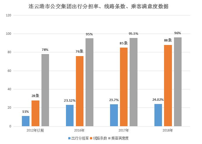 2012年之前,我市運(yùn)營公交線路僅有28條,車輛數(shù)370臺,社會承包車占比70%,車輛空調(diào)化率為23.7%,日均客流量為13.29萬人次,出行分擔(dān)率為11%,社會滿意率僅為78%。經(jīng)過六年精心耕作,公交發(fā)展指標(biāo)得到大幅提升。