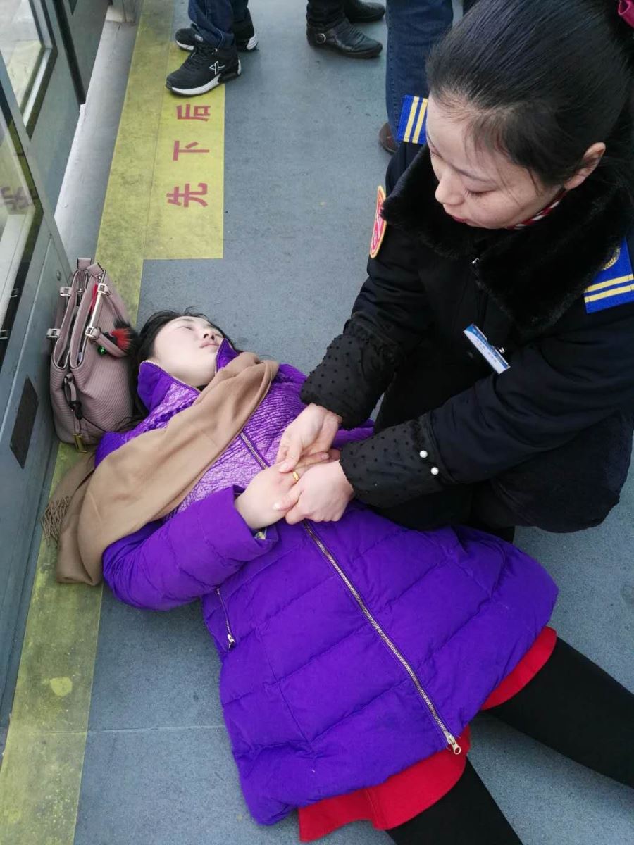 2018年1月26日下午16:15分,購(gòu)物中心站內(nèi)發(fā)生了驚心動(dòng)魄的一幕:一名中年女子在站臺(tái)內(nèi)等車(chē)時(shí),突然暈倒失去意識(shí),頭撞在BRT安全門(mén)的擋板上,牙齒咬得咯咯作響疑似癲癇發(fā)作,當(dāng)班的站務(wù)員朱海瑞、楊廷鳳發(fā)現(xiàn)后跑上前去,只見(jiàn)倒地女子雙眼發(fā)直,嘴唇發(fā)紫,面部肌肉抽搐,口鼻中有分泌物流出,上下牙床緊緊咬住。朱海瑞來(lái)不及考慮立即將口袋中的員工卡塞入其口中,防止她咬傷舌頭,一邊用手用力搓乘客的手,同時(shí)楊廷鳳立即掏出手機(jī)報(bào)120,并有序指引乘客上下車(chē),維護(hù)好站臺(tái)秩序。隨后趕來(lái)的急救車(chē)對(duì)女子進(jìn)行了初步診斷,確定為癲癇,在朱海瑞和醫(yī)生的幫助下,患病乘客已漸漸恢復(fù)正常,原來(lái)這位乘客由于家里有急事,忘記吃藥。朱海瑞立即端來(lái)熱水方便乘客服用隨身攜帶的藥物并不時(shí)安慰她,經(jīng)過(guò)120醫(yī)生再次診斷身體無(wú)礙后,這名女士才踏上回家的路。