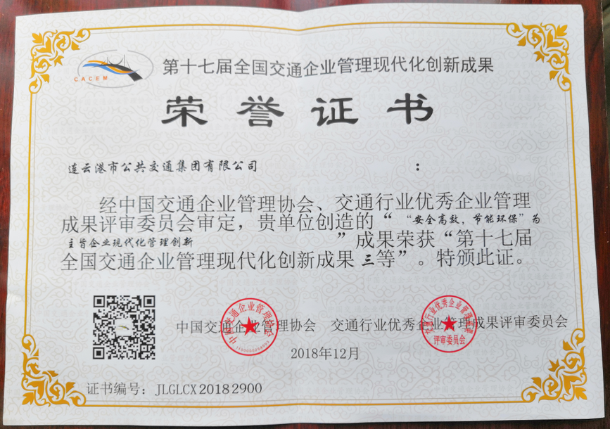 公交集團(tuán)喜獲第十七屆全國(guó)交通企業(yè)管理現(xiàn)代化創(chuàng)新成果三等獎(jiǎng)