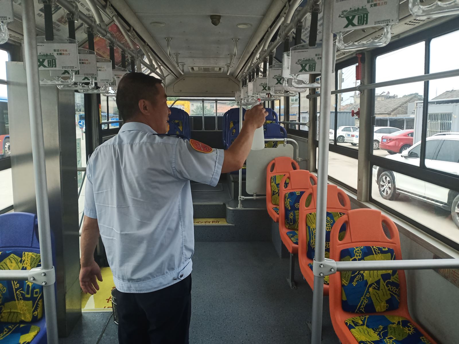 為了給乘客營造一個干凈、健康的乘車環(huán)境,駕駛員在第一時間為愛車“清洗”,首先利用洗車機將車身外部清洗干凈,然后對車廂內(nèi)部進行打掃,擦拭駕駛室內(nèi)的衛(wèi)生死角,拖地板、擦玻璃、座椅、扶手等。為確保疫情期間做好防控工作,還要對車內(nèi)進行消毒,并打開門窗通風透氣。